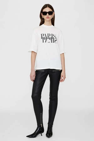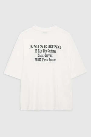 The Avi Tee Paris is an oversized, boxy T-shirt constructed from lightweight 100% organic cotton jersey in ivory. It features a screen-printed mirrored graphic at the chest in contrast black with the ANINE BING Paris store address across the back.