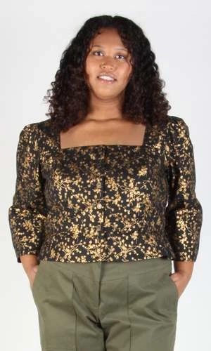 Our most opulent print of the season, this cotton has bright gold highlights that catch the light beautifully on a black background. This colourway features Italian metal buttons to compliment the metallic print.