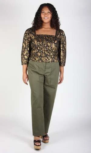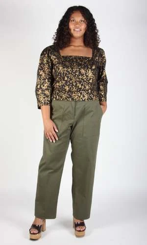 Flinthead is a waist-length, button front top with a square neck, a peplum and lantern sleeves. Its made of cotton, and is fully lined in cotton voile.