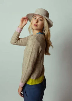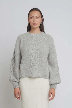 Vaida is a relaxed, airy, sweater with a feminine-blouson sleeve, hand-knit with the softest air-spun alpaca-yarn with sumptuous, horse-shoe cables at center-front and sleeve and lofty jersey stitch on the body and sleeves. Vaida looks chunky, but is extremely lofty. This piece is perfect to style in a relaxed or polished way, whatever your mood.