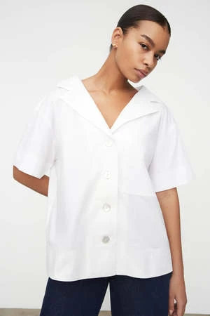 A naval inspired short sleeve shirt, made from 100% certified Fairtrade organic cotton poplin shirting. The Seascape Shirt has an oversized fit with drop shoulders and a wide open neckline. It is defined by an exaggerated jacket style collar and large agoya shell buttons. It features a front patch pocket, back box pleat and side splits.