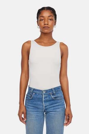 An everyday essential. A fitted tank bodysuit with a high flattering neckline and plunging low back. Thong bottom for the best fit under your favorite trousers. Made from our Organic Flex fabric for support and the most buttery soft feel. Content + Care