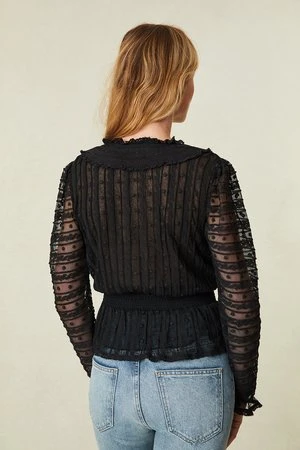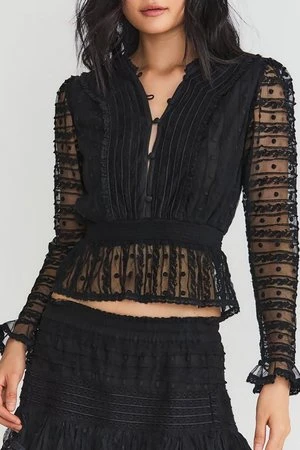 – Sheer long blouson sleeves with elasticated ruffle openings.