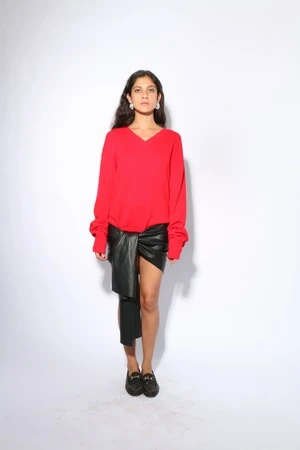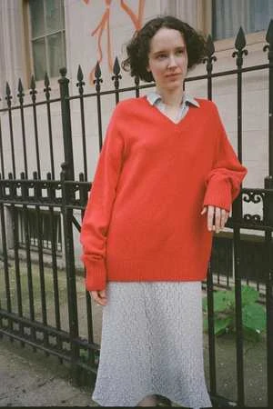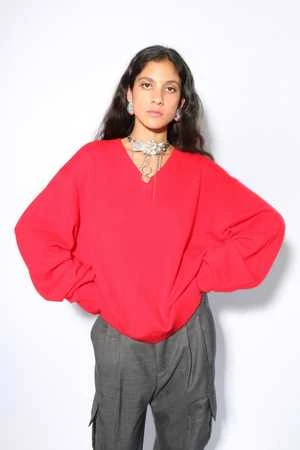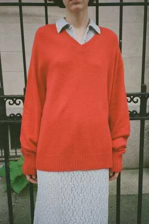 A sweater everybody needs this season. Slightly oversized, wide set v neckline, and long luxurious sleeves. The Davis sweater in true red is a perfect staple for the winter wardrobe. Unisex style.