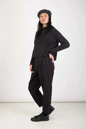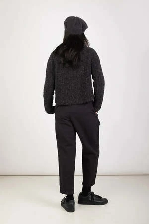 A cropped little knit top made from a curly boucle Alpaca yarn. Features a high neck and raglan sleeve. Designed in California and knit in Peru using locally sourced yarns colored using GOTS certified dyes.
