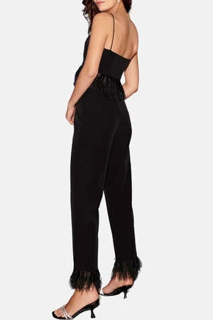 The SAYLOR Messika Feather Suiting Pant Set is a two-piece set with feathers at the cuffs and bottom of top. Features straight neckline and spaghetti strap top and front pockets on high-waisted pants.