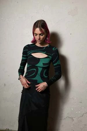 The Myran Top features UIM custom artwork Napthe. Flattering long sleeve top crafted from soft certified organic cotton and modal jersey. Features a cut out on front and back, and fitted through the body.